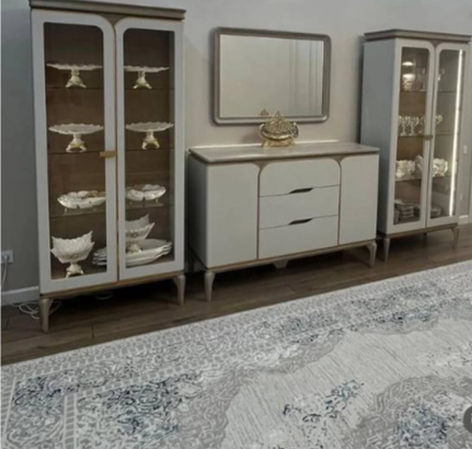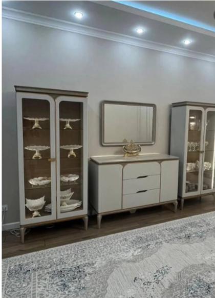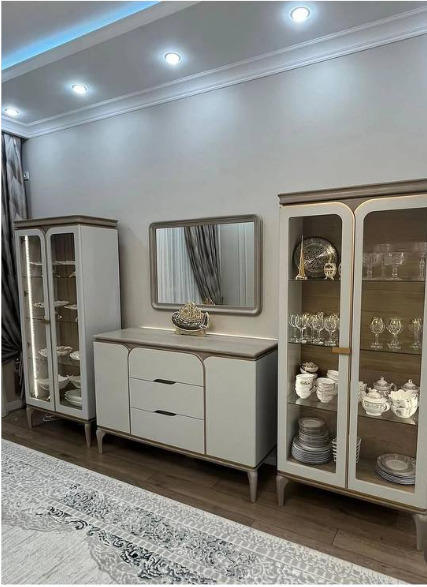 «Дуб жемчужный» с фасадами в цвете «Айвори» с отделкой под золото, подчёркивающей образ изделий.