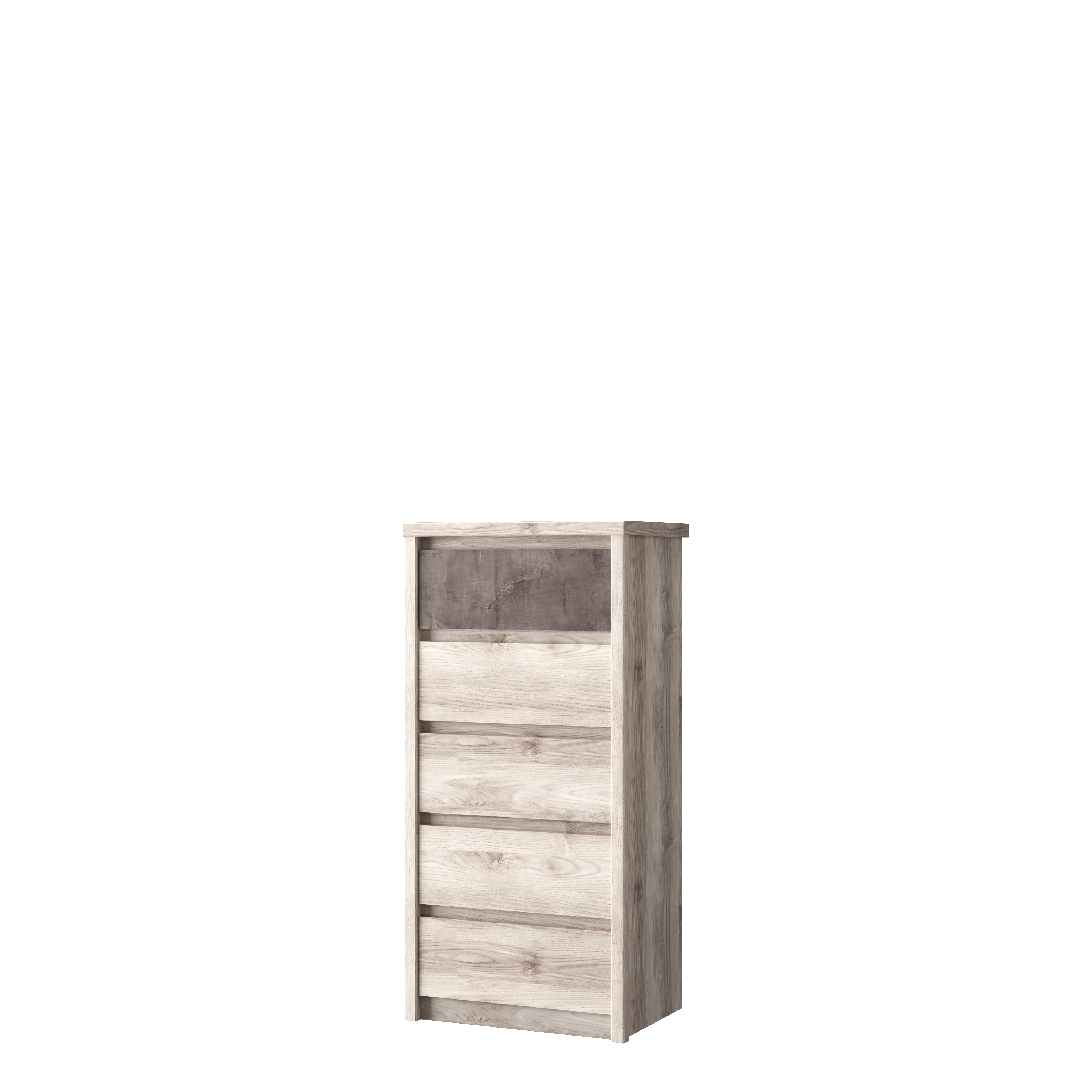 Комод 5S/56 JAZZ организует удобное и компактное хранение белья, предметов одежды и других вещей в интерьере молодёжной комнаты, спальни (особенно в помещениях с маленькой площадью). Конструкция прямая, представляет собой пять выдвижных ящиков (5S), расположенных друг над другом.