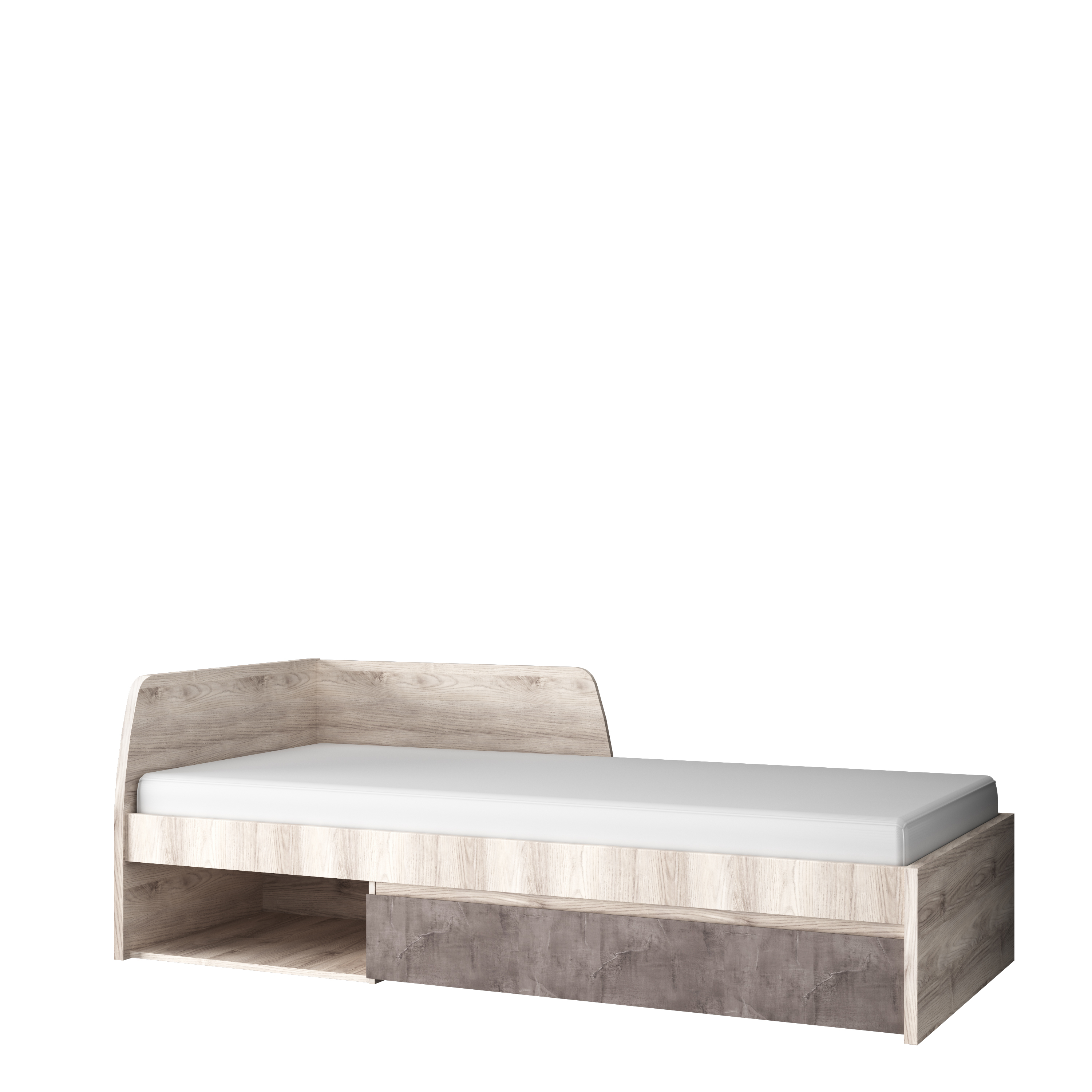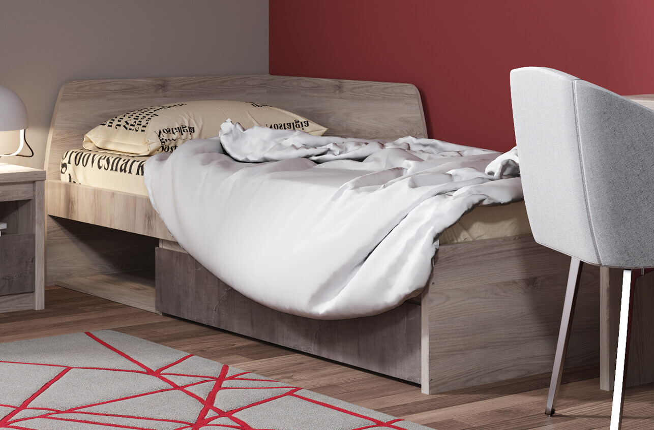 Кровать 90 JAZZ – очень модное и современное решение для организации зоны отдыха и сна в молодёжной/детской комнате. Кровать 90 JAZZ – односпальная, размер спального места – 900*2000 мм. Конструкция кровати представляет собой угловое изголовье (можно установить и справа, и слева – учитывается при сборке), изножье прямоугольной формы, а также вместительный выдвижной ящик, открытая ниша (расширяет функционал кровати), основание кровати – щиты ЛДСП.