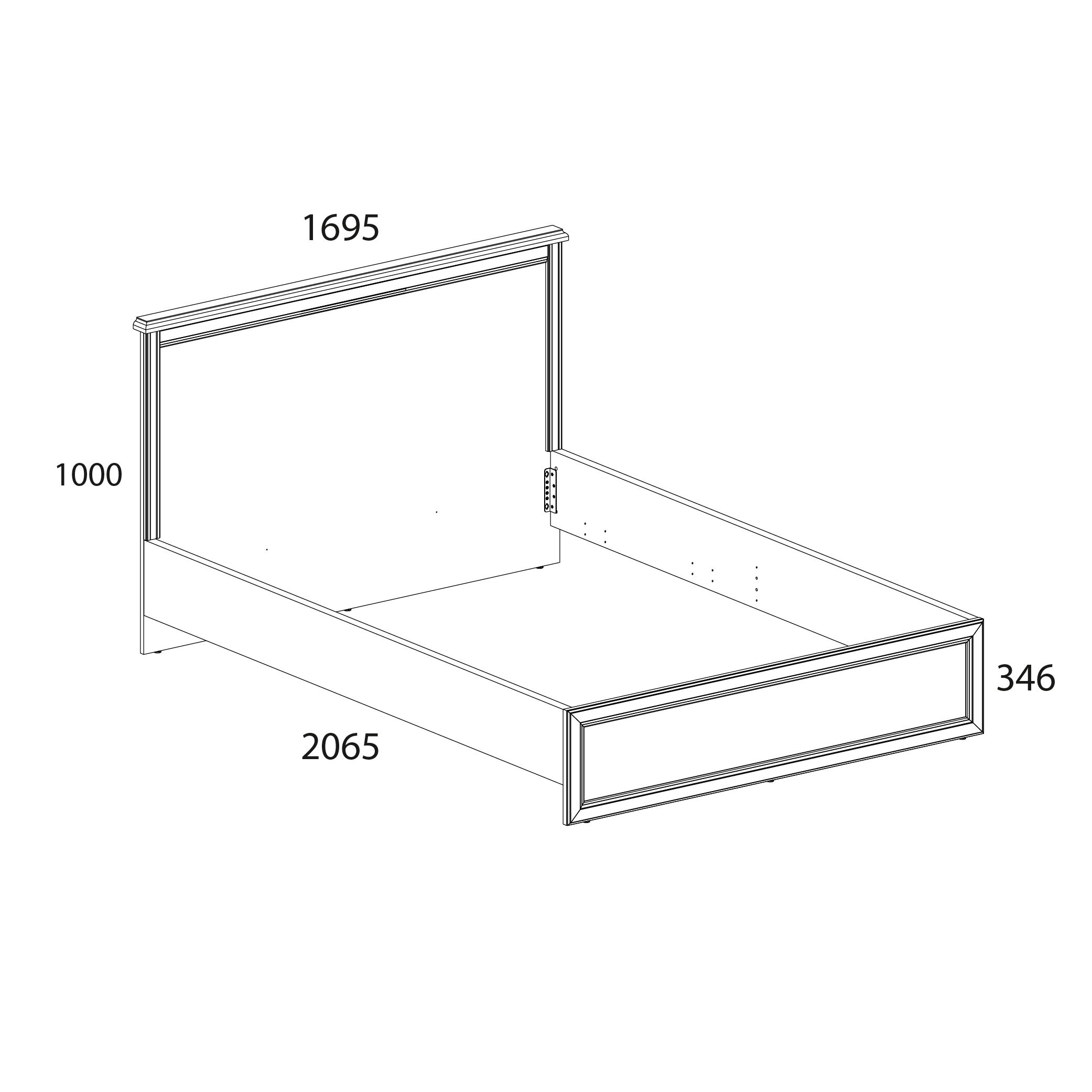 Кровать 160 MONAKO - двуспальная, размер спального места – 1600*2000 мм (ширина - 1695 мм, глубина - 2065 мм). Конструкция кровати представляет собой сплошное изголовье прямоугольной формы (с пилястрами, декоративной планкой) и изножье прямоугольной формы (обрамлённое патинированными планками из МДФ), царги и металлическое основание на ножках.