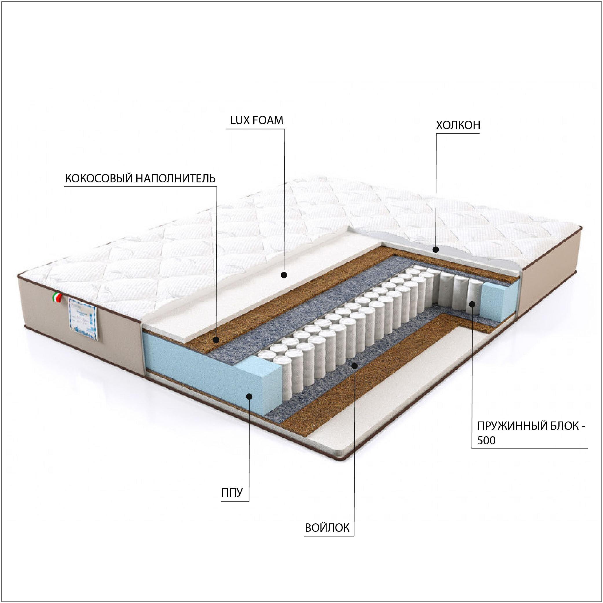 Наполнитель: LuxFoam 2 см, кокосовая койра 1 см, войлок – с двух сторон. Периметр матраса усилен массивной вкладкой ППУ.