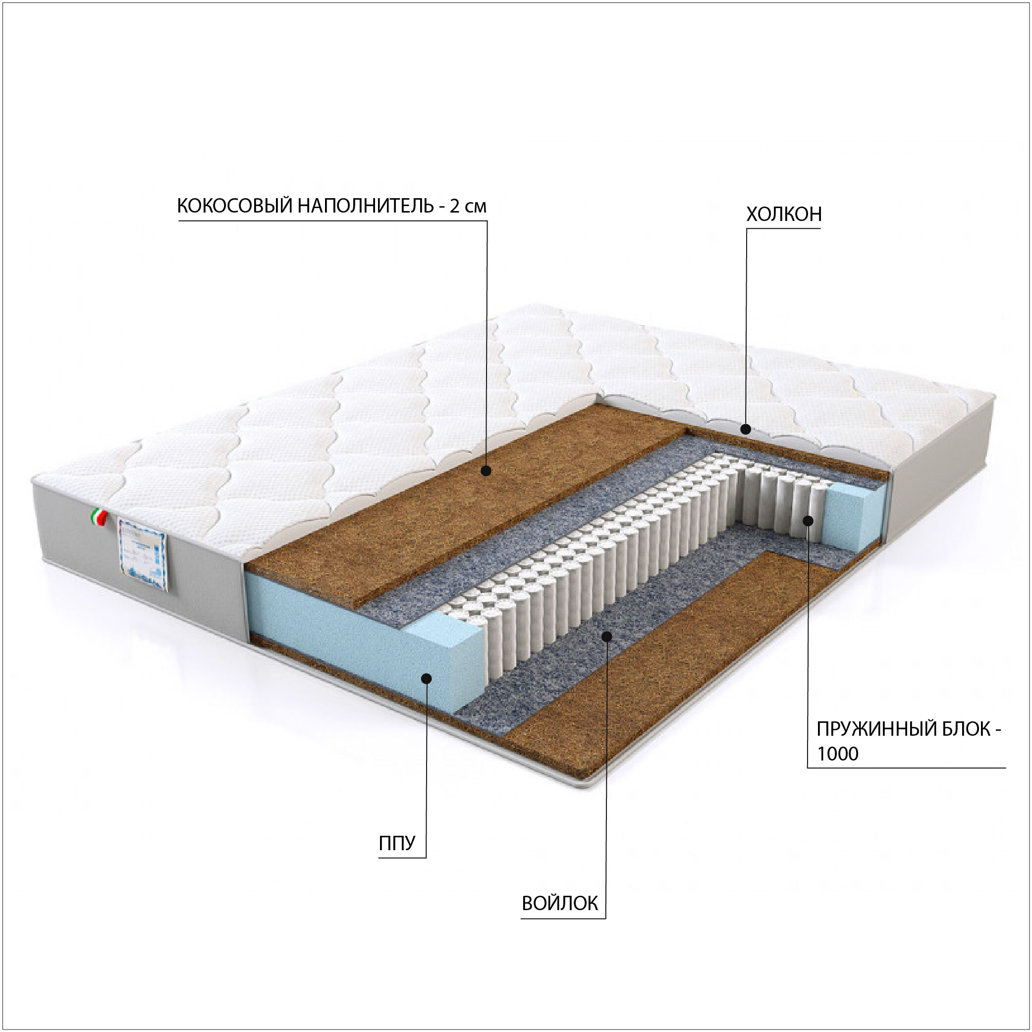 Наполнитель: кокосовая койра 2 см и войлок с двух сторон. Периметр матраса усилен массивной вкладкой ППУ.