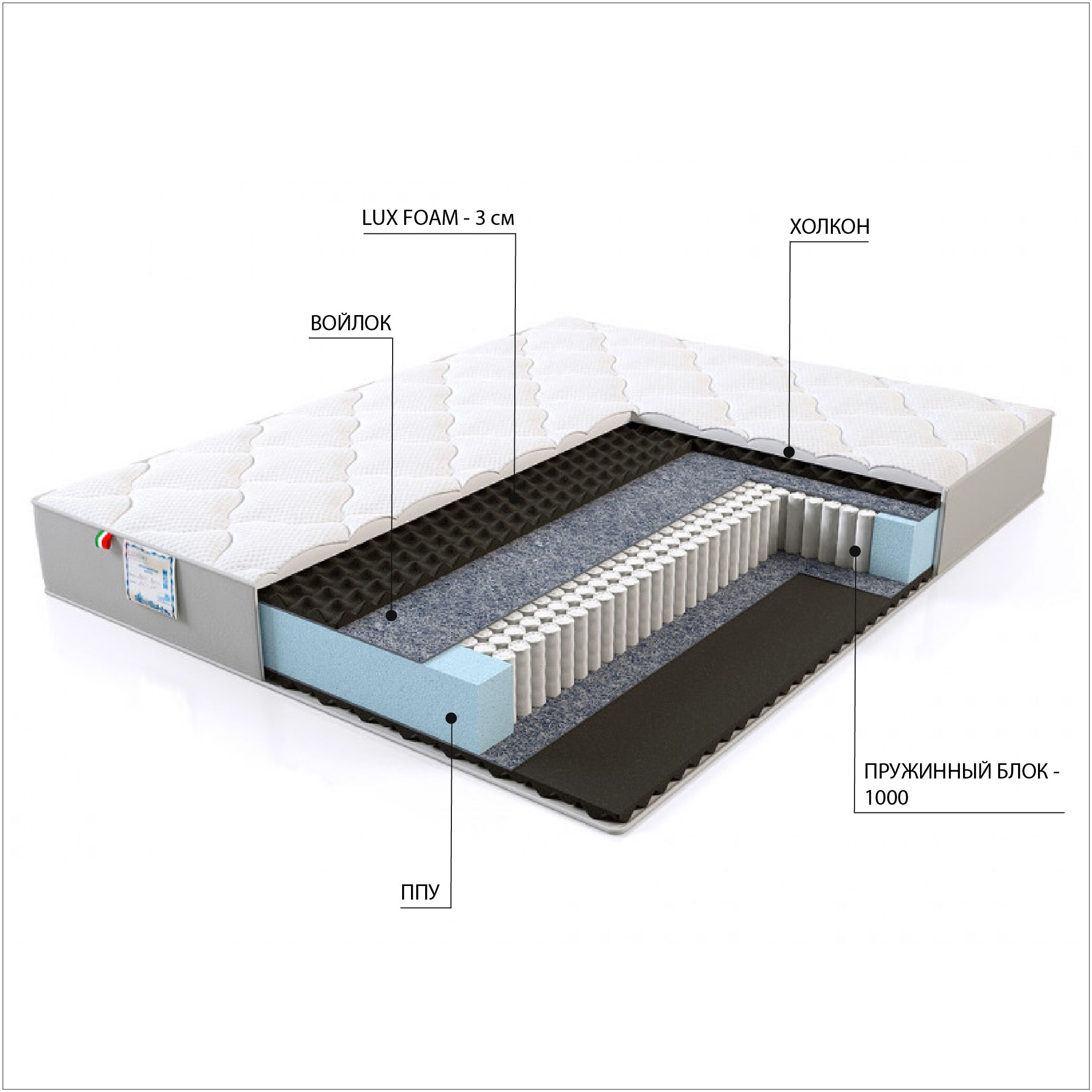Наполнитель: LuxFoam 3 см с микро массажным эффектом и войлок – с двух сторон. Периметр матраса усилен массивной вкладкой ППУ.