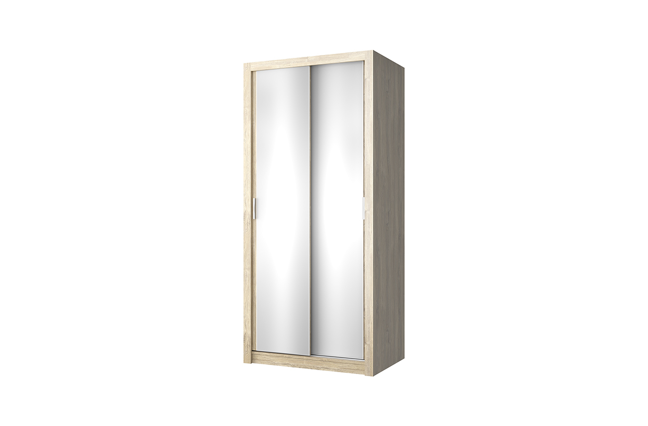 Шкаф 100 MILAN, ДУБ МАДУРА. Любая шкафная группа или отдельно стоящий шкаф – это организация хранения предметов одежды, белья и других вещей. Но именно такая конструкция, как у шкафов-купе, не требует дополнительного пространства для открытых дверей. Шкаф-купе 100 MILAN может оформить функционал в любой комнате – гостиная, небольшая спальня, молодёжная/детская комната, прихожая, гардеробная зона. Конструкция шкафа 100 MILAN прямая, представляет одно отделение с внутренней перегородкой, которая разделяет его на отделение с полками ЛДСП и на гардеробное отделение с продольной стационарной штангой, полкой ЛДСП за двумя раздвижными дверями (с внешней стороны фасадов крепятся зеркала). Кодировка «100» обозначает ширину изделия из ряда представленных. Особенностью элемента является практичность в небольших по площади комнатах, вместительность, универсальность, наличие двух зеркал, что визуально расширит пространство.