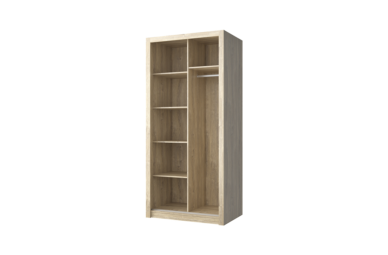 Шкаф 100 LYON, ДУБ МАДУРА. Любая шкафная группа или отдельно стоящий шкаф – это организация хранения предметов одежды, белья и других вещей. Но именно такая конструкция, как у шкафов-купе, не требует дополнительного пространства для открытых дверей. Шкаф-купе 100 LYON может оформить функционал в любой комнате – гостиная, небольшая спальня, молодёжная/детская комната, прихожая, гардеробная зона. Конструкция шкафа 100 LYON прямая, представляет одно отделение с внутренней перегородкой, которая разделяет его на отделение с полками ЛДСП и на гардеробное отделение с продольной стационарной штангой, полкой ЛДСП за двумя раздвижными дверями. Кодировка «100» обозначает ширину изделия из ряда представленных. Особенностью элемента является практичность в небольших по площади комнатах, вместительность, универсальность.