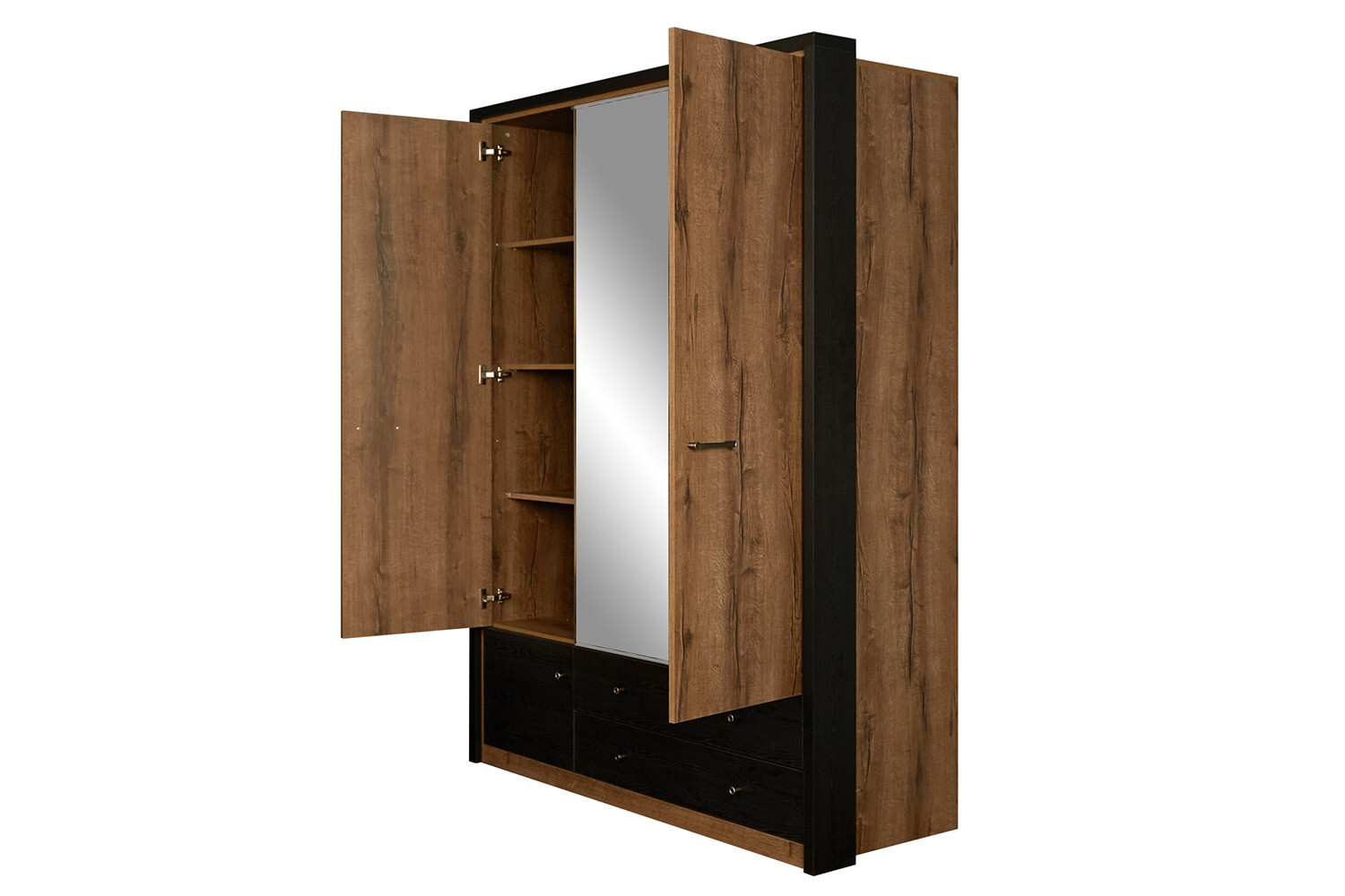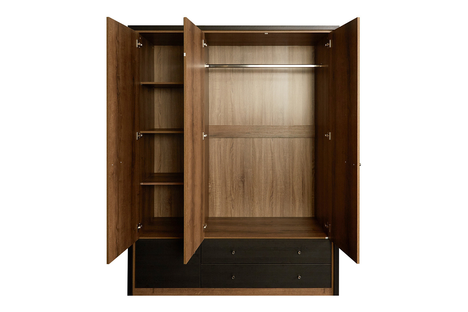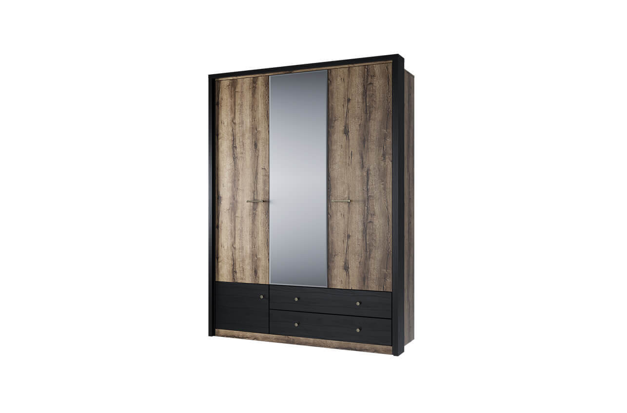 Шкаф 3DG2S Z JAGGER – это смелое и оригинальное решение для интерьера спальни в современном стиле. Контрастное сочетание текстур – дуб Монастырский и чёрный – добавляет элементу неординарный характер, а также один оттенок подчёркивает уникальность другого. Конструкция шкафа 3DG2S Z JAGGER прямая, представляет собой одно гардеробное отделение со штангой за двумя глухими дверями, одно отделение с полками за глухой дверью, два выдвижных ящика (2S). Двери распашные, крепятся на петли к боковому корпусу и внутренней перегородке. На средней двери (снаружи) крепится зеркало (Z). В изделии используется декоративная накладка в чёрном цвете.