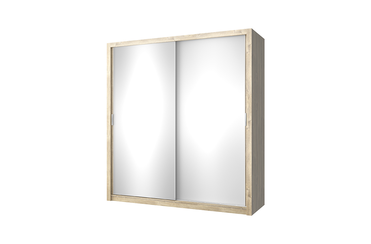 Шкаф 203 MILAN, ДУБ МАДУРА. Данную модель отличает разнообразное внутреннее наполнение, что позволит разместить не только предметы одежды, белья и обувь, но и другие вещи. Шкаф-купе 203 MILAN может оформить функционал в любой комнате – гостиная, спальня, молодёжная/детская комната, прихожая, гардеробная зона. Конструкция шкафа 203 MILAN прямая, представляет четыре отделения с продольными стационарными штангами, десять (10) ниш за двумя раздвижными дверями (с внешней стороны фасадов крепятся зеркала). Кодировка «203» обозначает ширину изделия из ряда представленных. Особенностью элемента является практичность, вместительность, универсальность, наличие двух больших зеркал, что визуально расширит пространство.