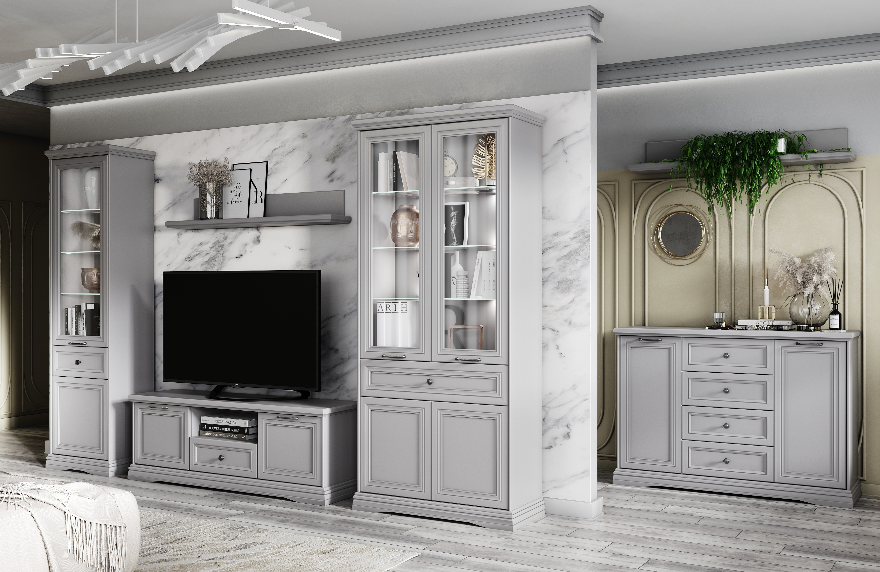 Материал: рамочно-филенчатая конструкция глухого фасада, рамка МДФ – 19 мм, филенка ЛДСП – 8 мм, цвет – серый 612 ТМ; витрина – закалённое стекло, 4 мм в рамке МДФ.