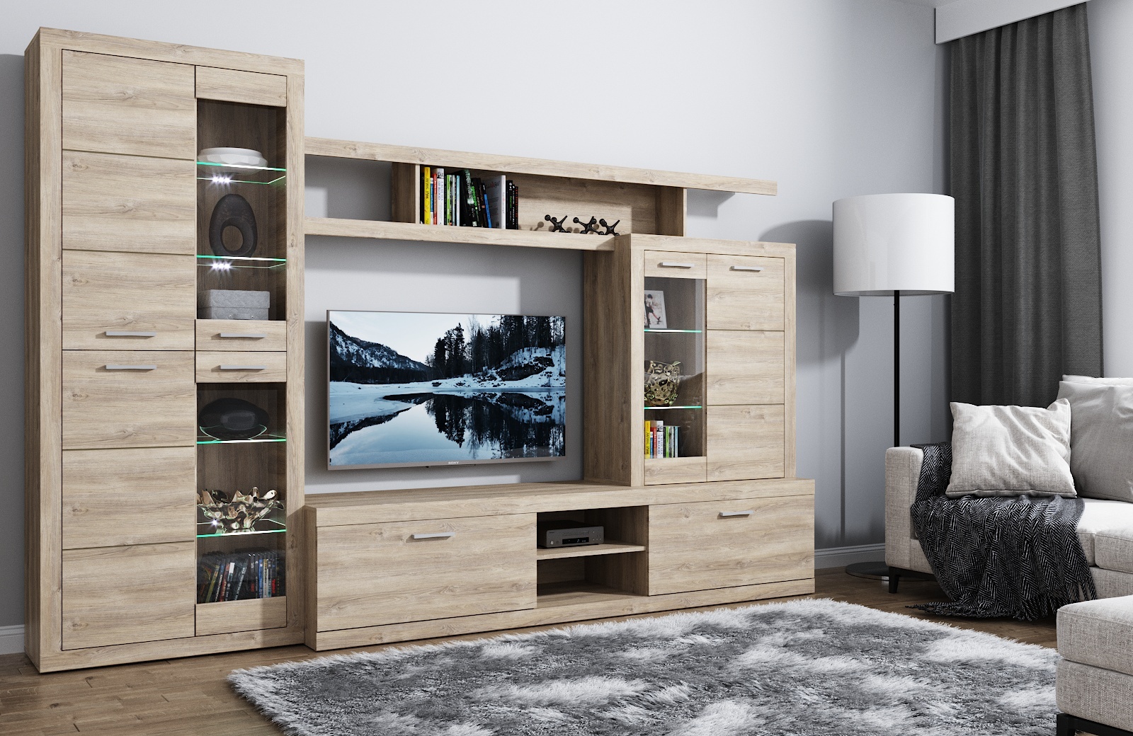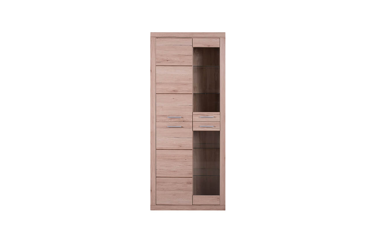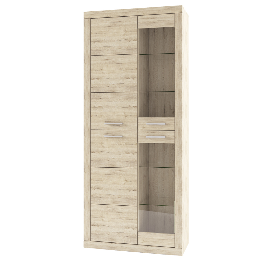 Материал: ЛДСП – 16 мм, цвет – дуб санремо 350 SWN; закалённое стекло – 4 мм (витрина).