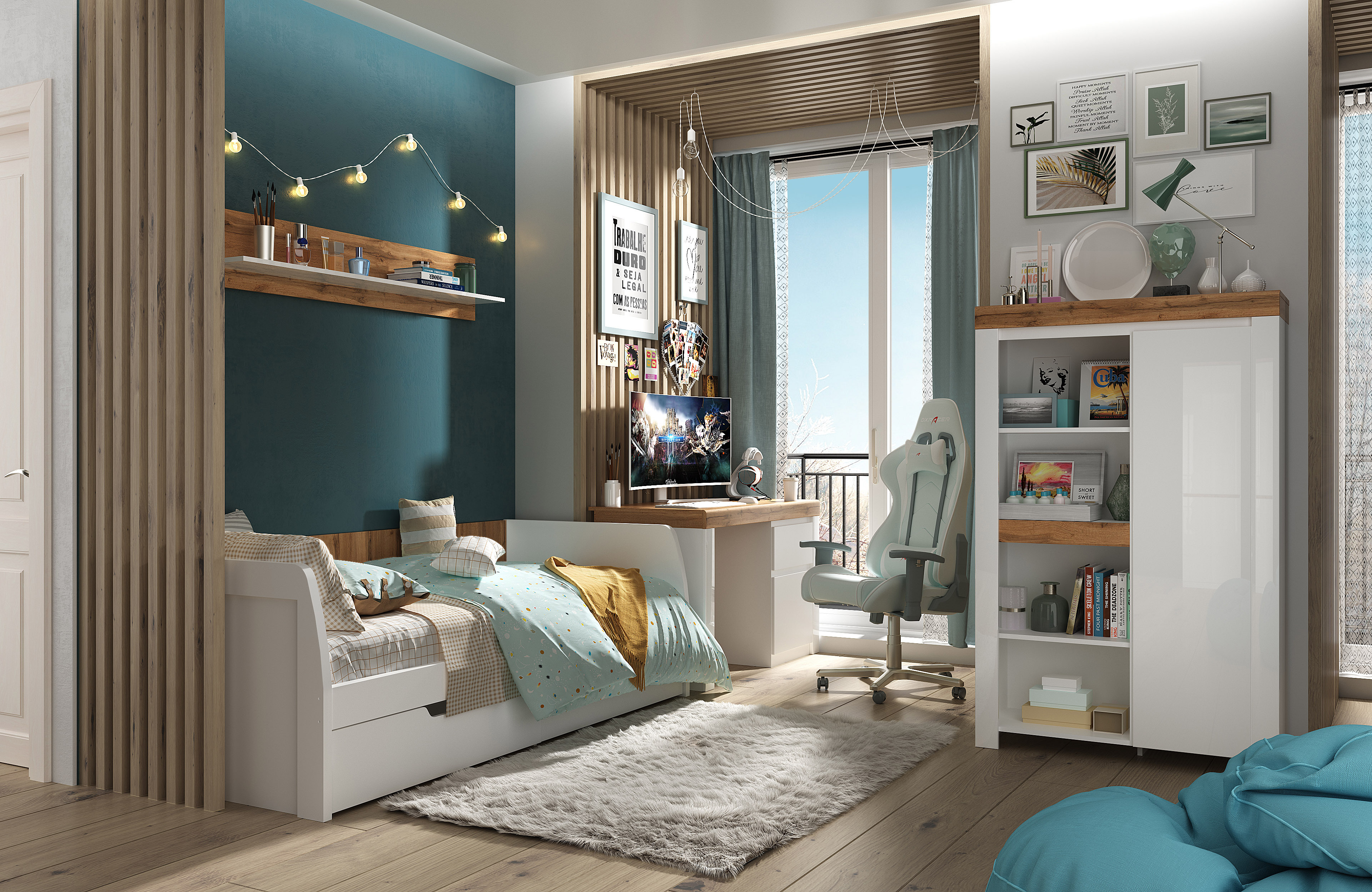 Стол письменный 1D1S TAURUS – организация рабочей/учебной зоны в молодёжной/детской комнате. Благодаря стильному дизайну и сочетанию контрастных текстур, модель будет визуально легко располагаться в интерьере. Конструкция стола письменного 1D1S TAURUS прямая, представляет столешницу прямоугольной формы в древесной текстуре, стационарную тумбу с одним отделением за одной глухой дверью (1D) и одним выдвижным ящиком (1S), левую опору. Элемент точно повторят стилистику других элементов коллекции за счёт сочетания текстур, а также вертикальных планок на опорах и сборного верхнего щита. Особенностью элемента является использование петель с доводчиками, стиль и практичность.