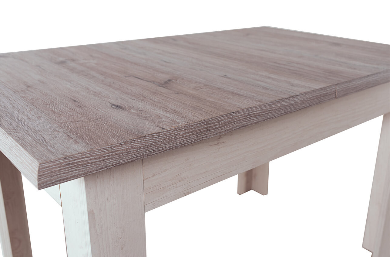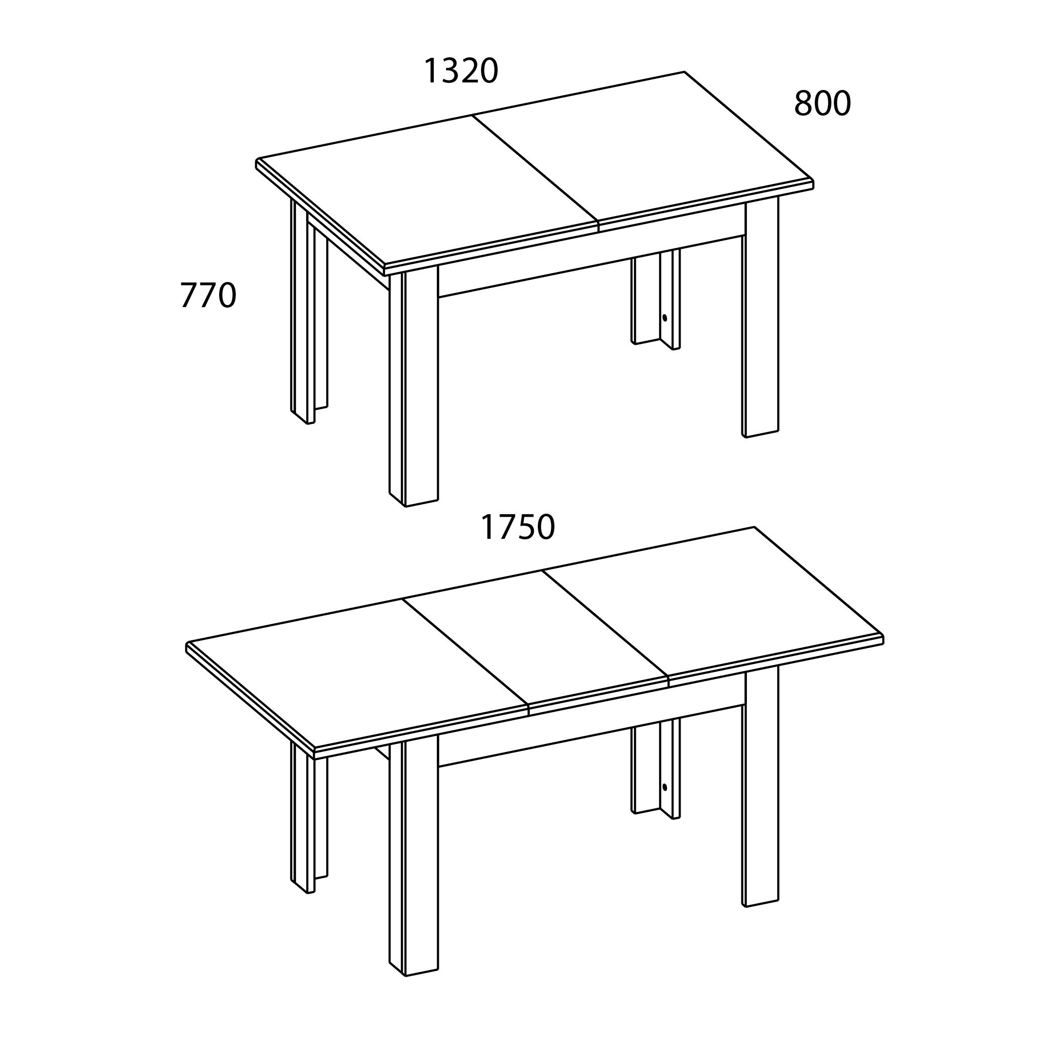 Стол раздвижной MONAKO – не только удобный и мобильный предмет мебели, но и красивое включение в интерьер гостиной, столовой или кухни. Конструкция элемента представляет собой столешницу в цвете дуб Анкона из двух частей прямоугольной формы, под столешницей имеется отсек для хранения дополнительной детали, которая при необходимости вставляется между двумя частями столешницы для увеличения обеденного пространства. Расположение угловых ножек (4 шт.) даёт возможность удобно разместить стулья возле стола.
