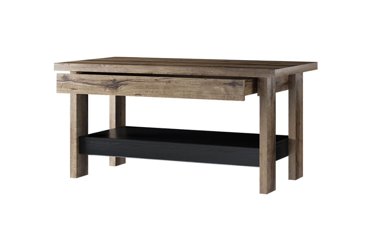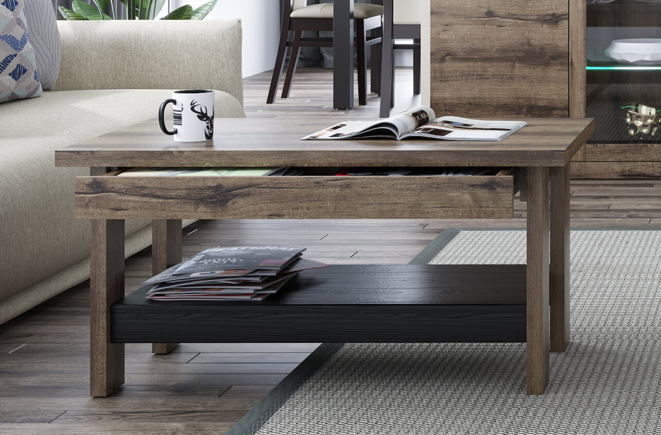 Стол журнальный JAGGER добавит в интерьер гостиной больше функциональности и притягательности. Конструкция элемента представляет собой столешницу прямоугольной формы, выдвижной ящик и сборную стационарную полку. Изделие устанавливается на четыре опоры.