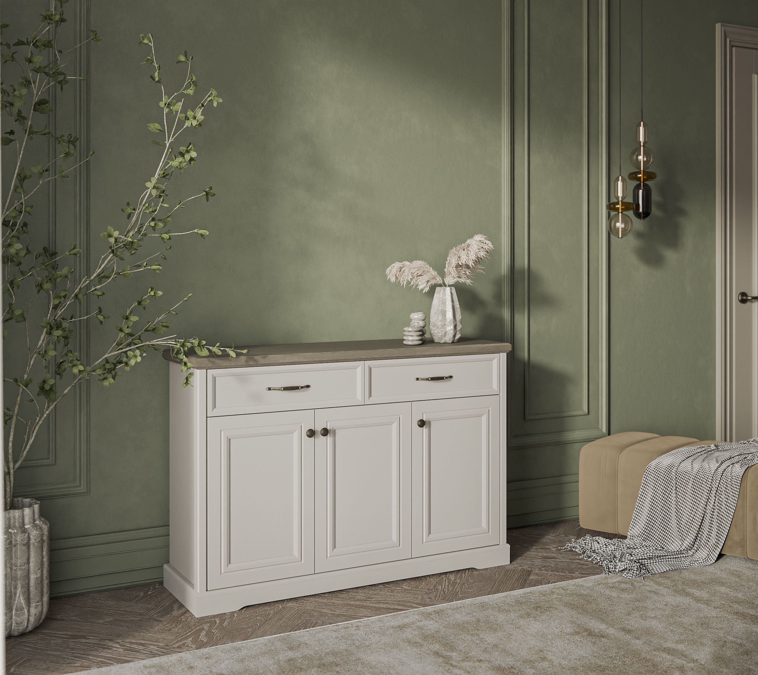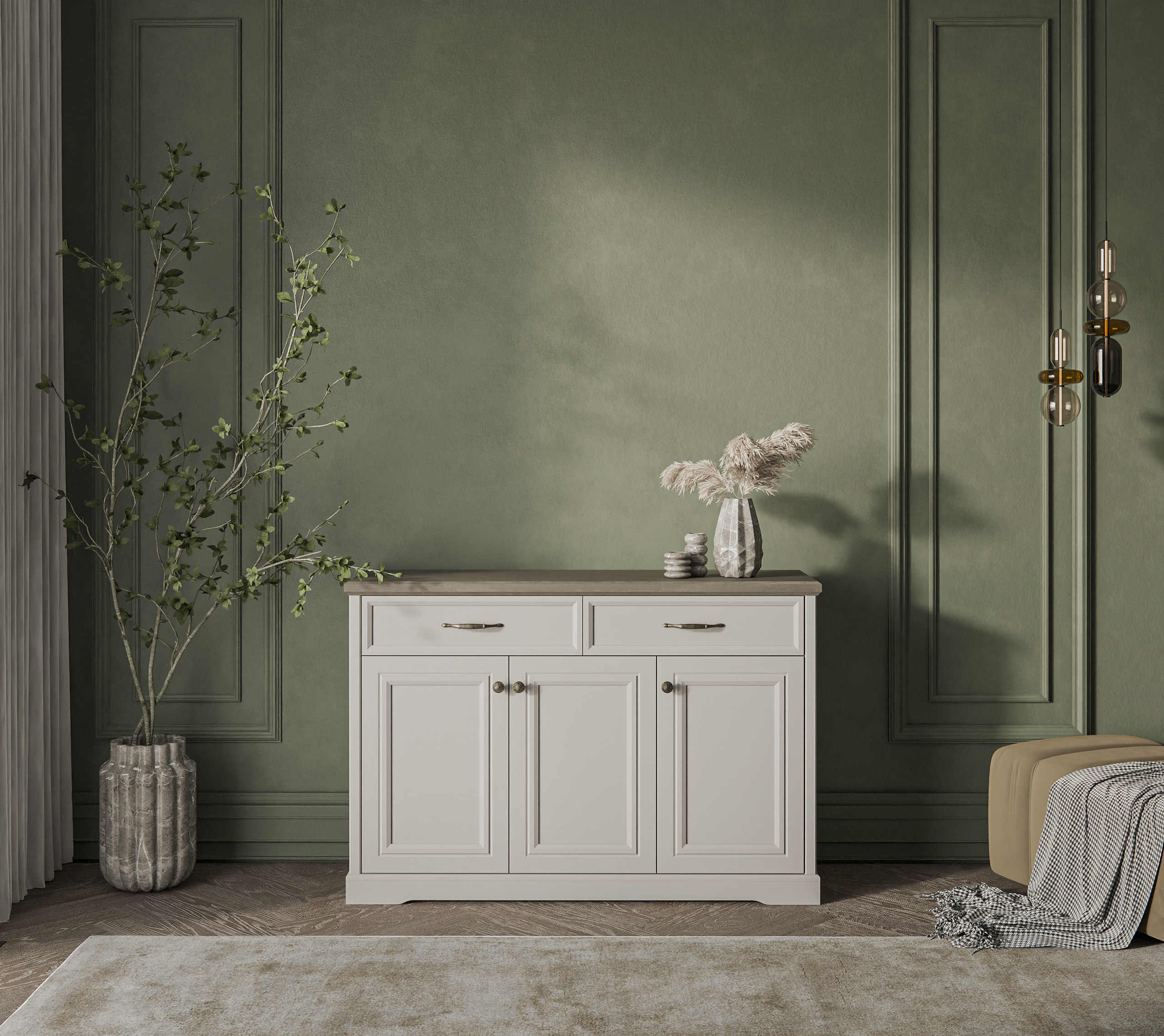 Материал: рамочно-филенчатая конструкция глухого фасада, рамка МДФ – 19 мм, филенка ЛДСП – 8 мм, цвет – персидский жемчуг 810 PO; фасады выдвижных ящиков – ЛДСП (16 мм - основа), МДФ (9 мм - планка), цвет – персидский жемчуг 810 PO.