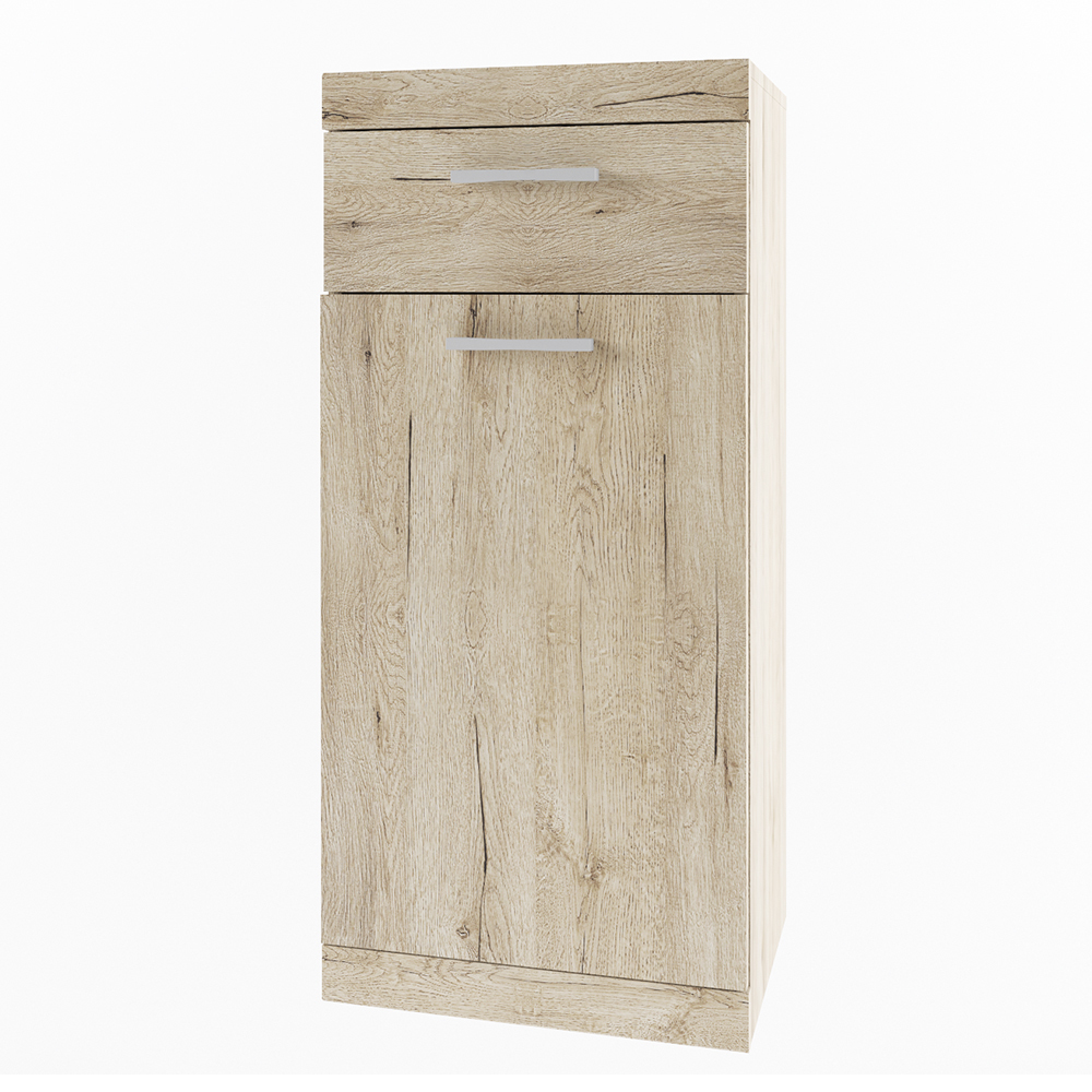 Тумба 1D1SH OSKAR в комбинации с другими модулями коллекции организует разнообразные комплектации прихожих для помещения любой площади. Конструкция тумбы 1D1SH прямая, H – high (высокий элемент в сравнение с тумбой 1D1S), представляет собой один выдвижной ящик (1S), одно отделение с полкой из ЛДСП за глухой дверью (1D). Дверь распашная, крепится на петли к боковому корпусу изделия.