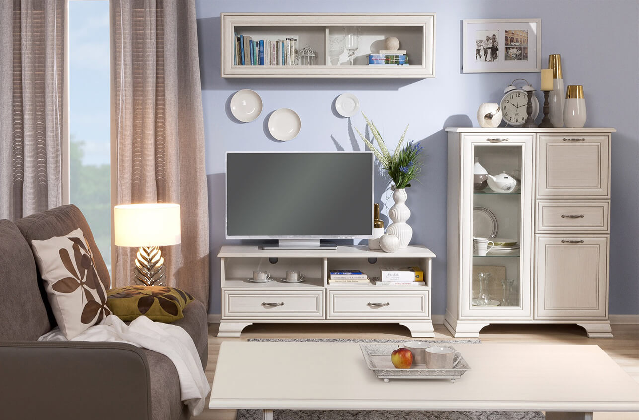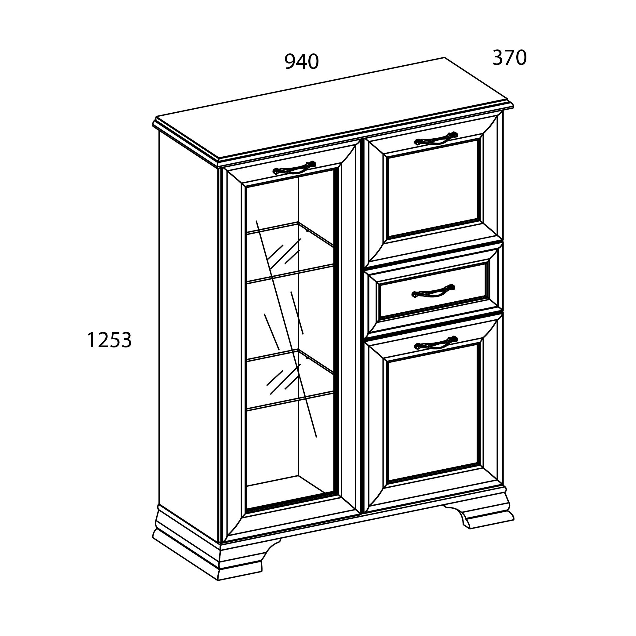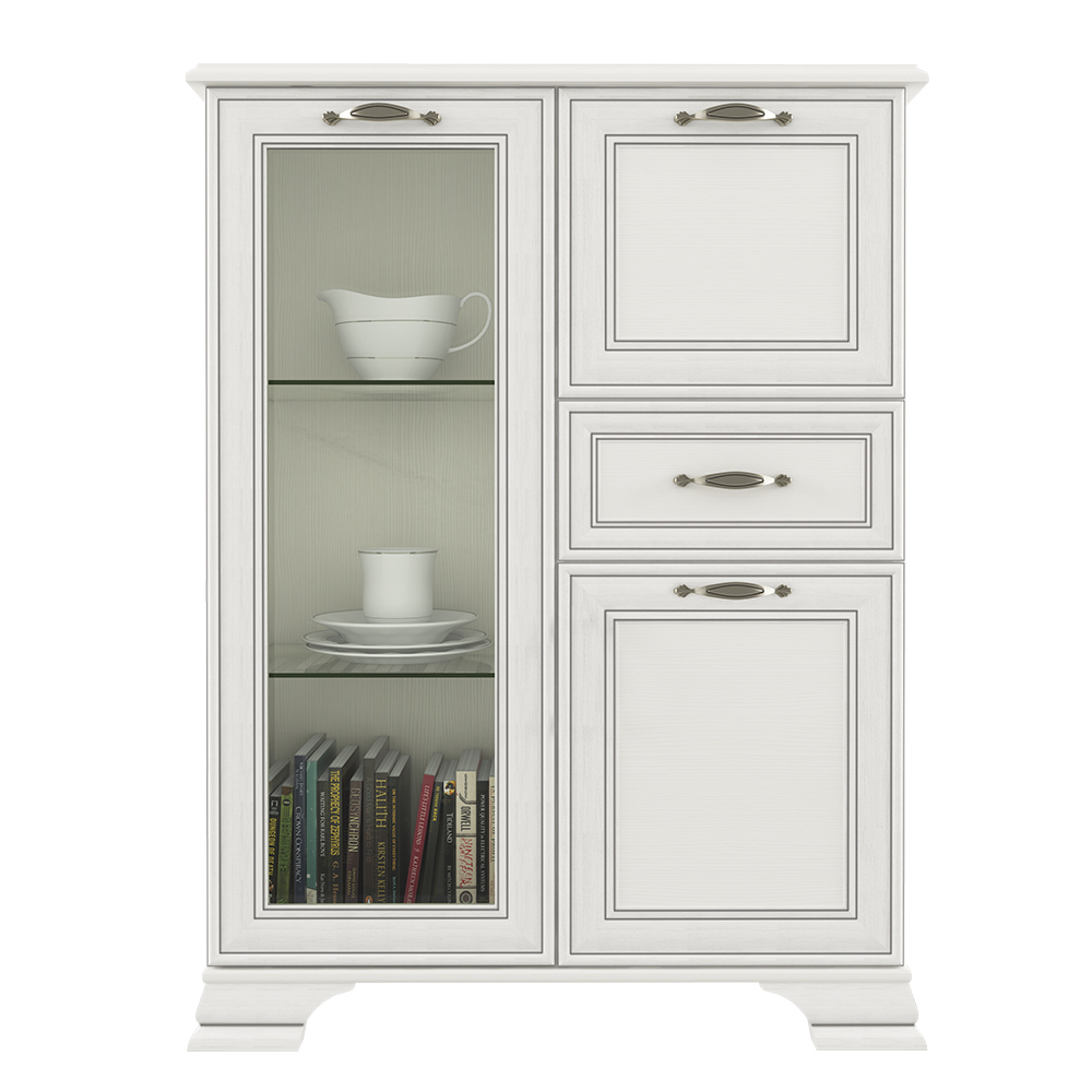 Тумба 1V2D1S TIFFANY. Такой элемент подходит для оформления интерьера в классическом стиле гостиной, столовой, кабинета. Конструкция тумбы 1V2D1S прямая, представляет собой две вместительные ниши с откидной дверью и распашной (2D – двери глухие), одно отделение с полками из закалённого стекла за витриной (1V – закалённое стекло) для хранения посуды, предметов декора и других вещей; один выдвижной ящик (1S).