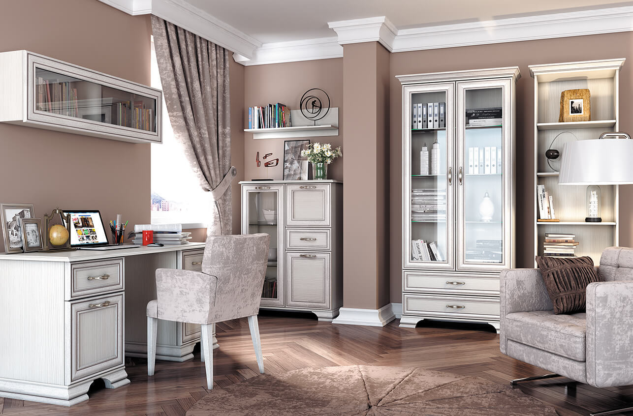 Материал: рамочно-филенчатая конструкция глухих фасадов - рамка МДФ – 19 мм (с нанесением патины), филенка ЛДСП – 8 мм, цвет – вудлайн кремовый (bodega 100 SWN); закалённое стекло в рамке МДФ – 4 мм (витрина).