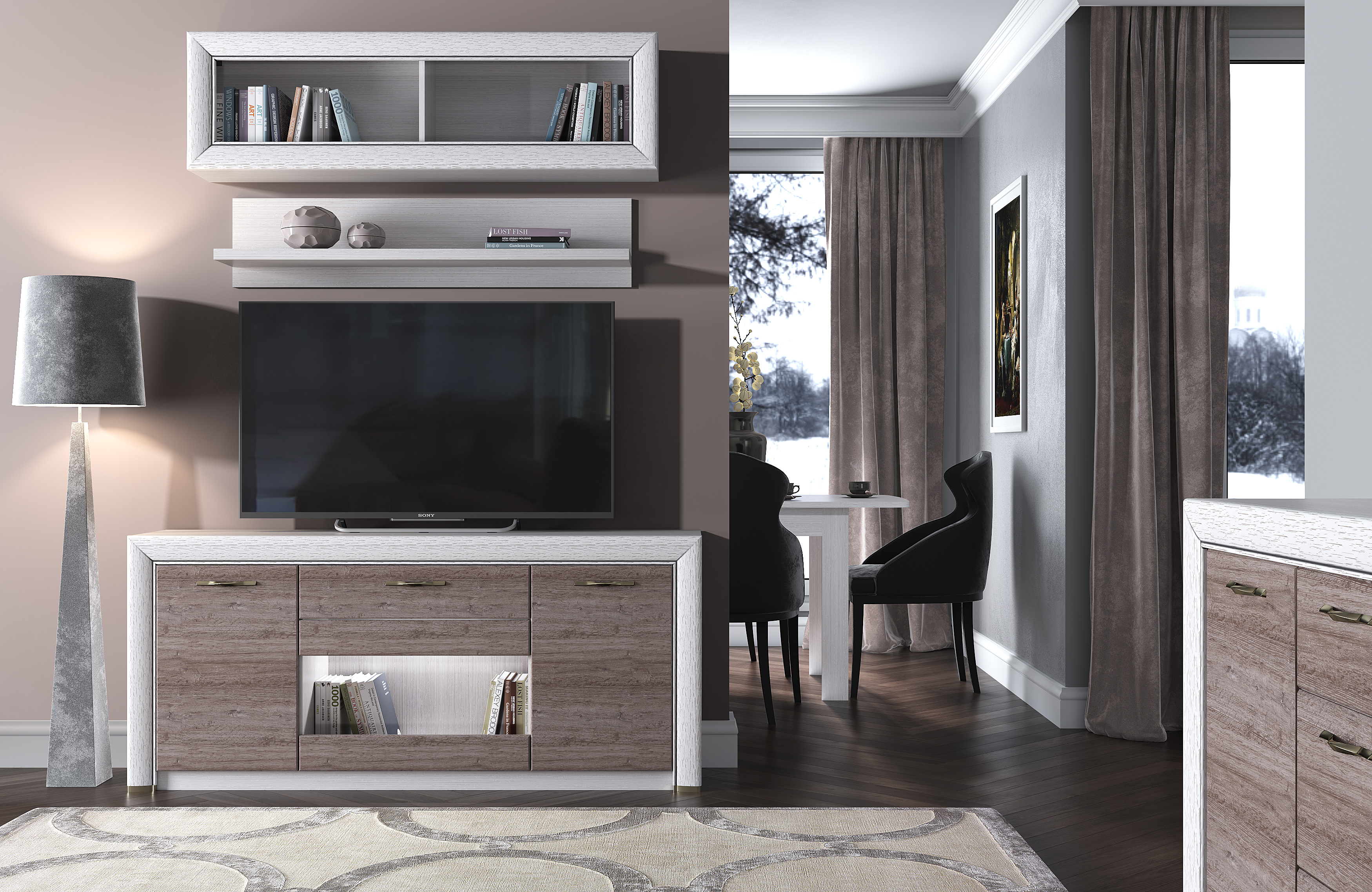 Материал: ЛДСП - 18 мм, МДФ - 25 мм - патинированные планки, закалённое стекло - 4 мм (витрина).
