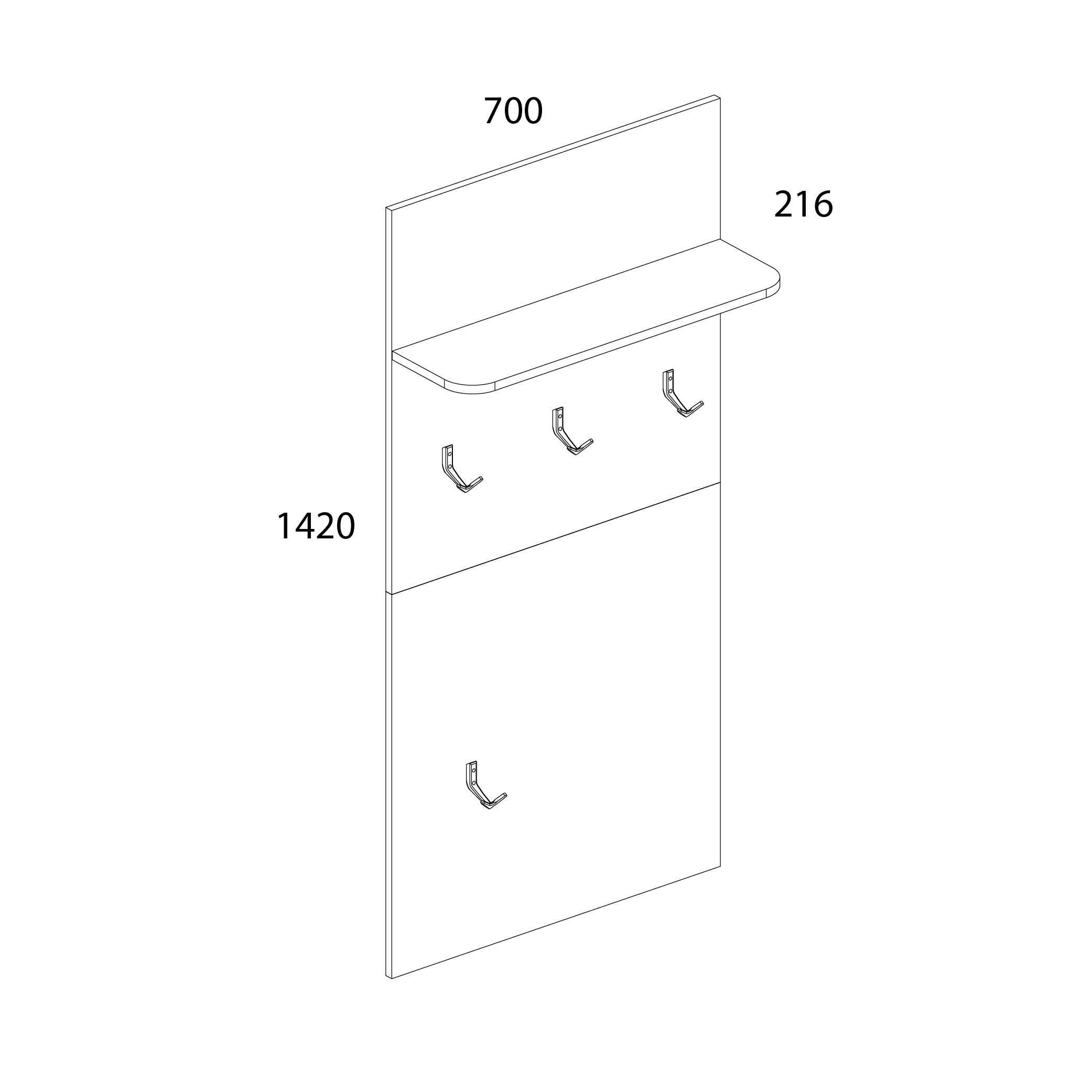 Вешалка TAURUS – один из самых необходимых предметов мебели, особенно в прихожих небольших размеров, так как модель навесная и сохраняет полезную площадь. Конструкция вешалки TAURUS прямая, навесная; представляет панель ЛДСП с двумя рядами крючков и полкой консольной. С минимальным набором элементов - тумба для обуви 2D1S, зеркало навесное, тумба для обуви 1D – оформит практичную и удобную прихожую, сохраняя больше свободного пространства.